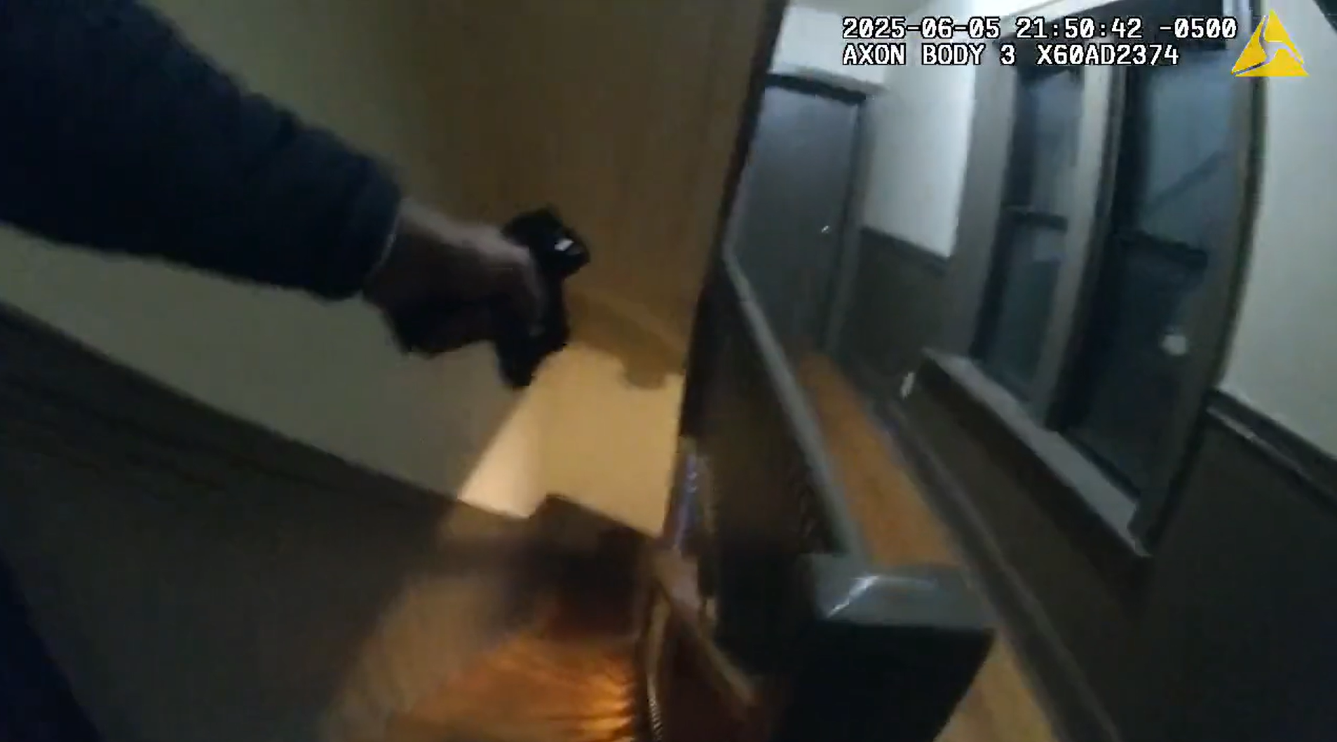 At one point, Baker’s body camera video showed Rivera standing in the hallway behind him as he kicks in a unit door. After the door opens, a suspect with what appears to be a firearm can be seen, and Baker can be seen jumping or moving out of the way.