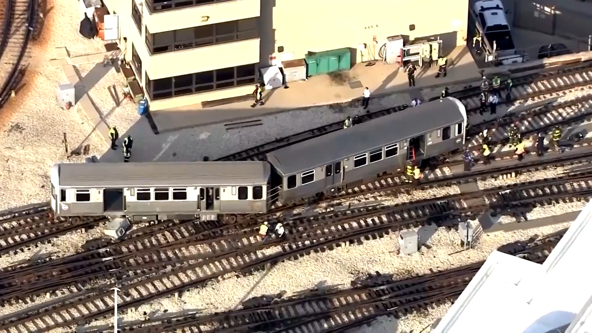 Aerial video showed dozens of officials on the tracks surrounding a train that appeared to be partially derailed.