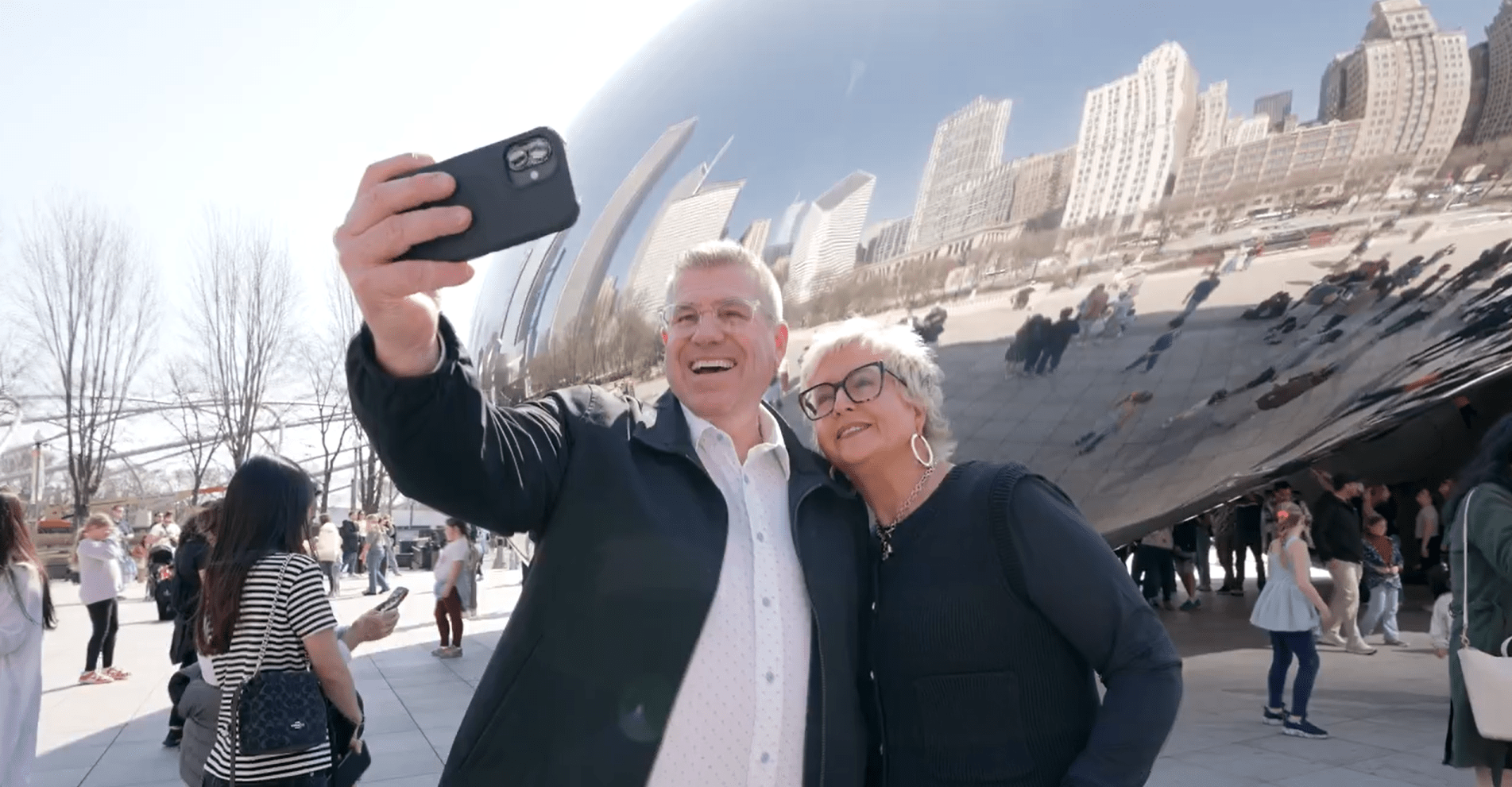 The video then dives into a montage of Del Mar, Bailey and his wife, Cindy Bailey, enjoying Chicago sights and snacks like the Skydeck at Willis Tower, a Chicago-style hot dog, Wrigley Field, Pizzeria Uno and more.