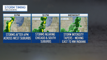 Between 8 and 10 p.m., storms will near Chicago, the lakefront and the south suburbs. By about midnight, storm intensity will taper as the system moves into northwest Indiana.